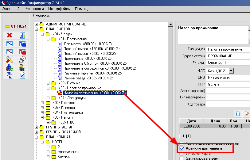 Нужно в Конфигураторе снова установить на статье "Налог за проживание" в ветке "План счетов" - "Услуги" - "Налог за проживание" - галочку в пункте "Артикул для налога":