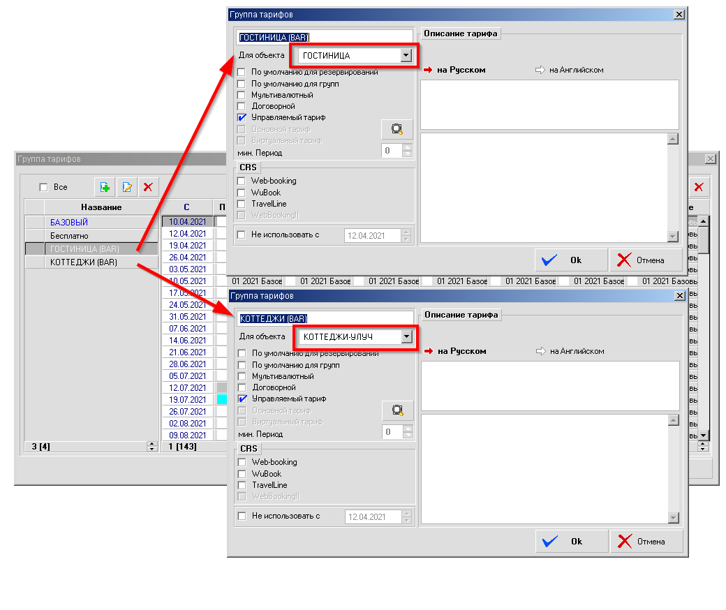 В версии АСУ 6.21.04 появилась возможность указания тарифа для определённого объекта в базе (объект - группа категорий / гостиниц / блоков / корпусов).