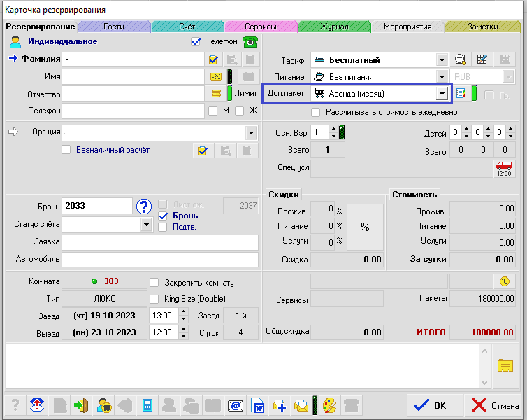 4. Далее выполняем начисление услуг проживания и получаем услуги аренды согласно указанным ранее датам.