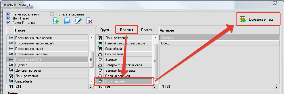 В левой колонке перечислены все ранее созданные пакеты, в которых и прописываются цены за проживание, питание. Существуют пакеты 3 типов:
