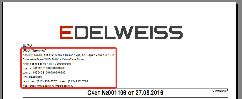 Для того, чтобы изменить реквизиты организации (банка / ИНН / телефона и т.д.) в печатных формах из АСУ Эдельвейс: