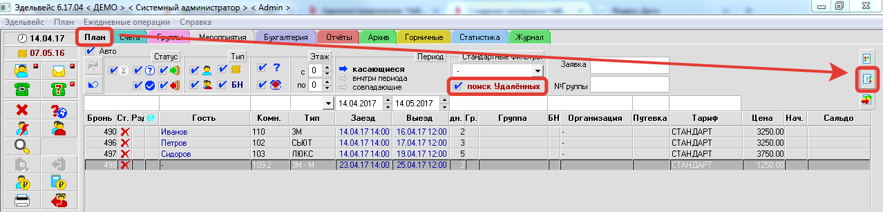В АСУ Эдельвейс все удаленные бронирования попадают в Корзину:
