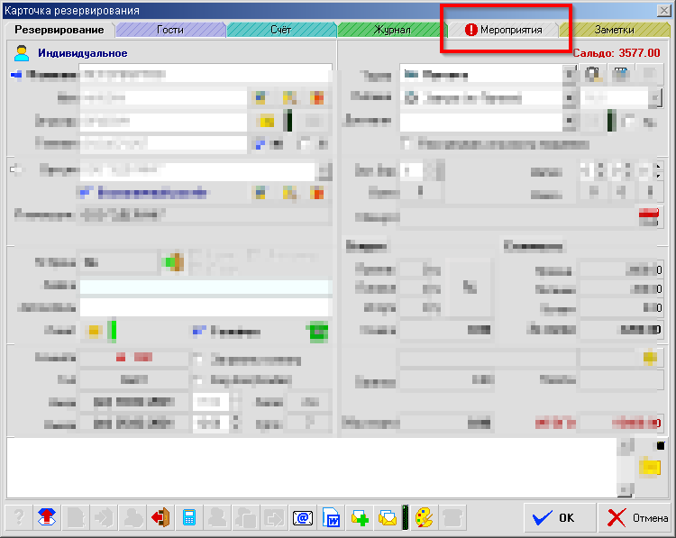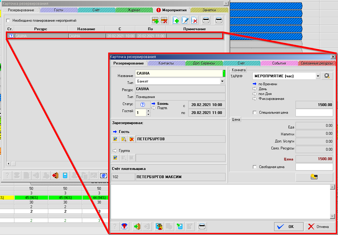 В случае начального бронирования Мероприятия из модуля и указания гостя из списка броней, данное мероприятие так же отобразится в закладке в карточке резервирования гостя автоматически.