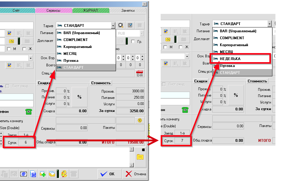 После указания значения, условие будет применяться к тарифам при создании брони (гостя / группы) исходя из количества суток проживания равного или большего указанного минимального периода у тарифов.