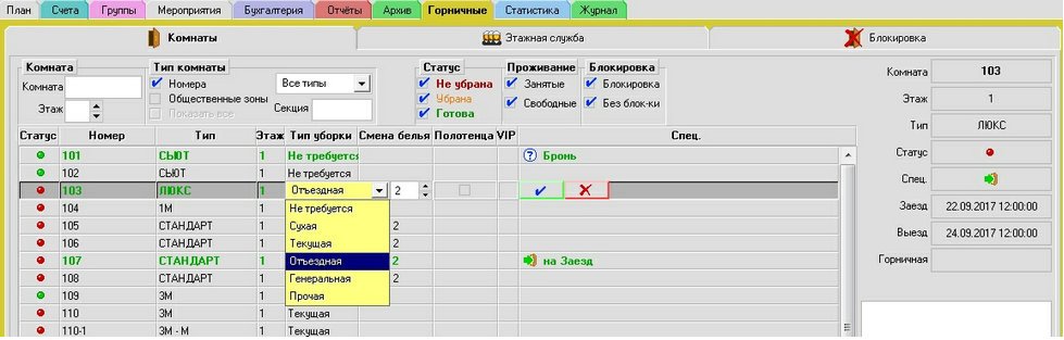Двойным щелчком мыши на строке номера запись переводится в режим редактирования, после чего пользователь может вручную задать любой тип уборки из выпадающего списка, указать количество комплектов белья для смены и выставить флажок «Мытье окон» (что также может подразумевать смену штор).