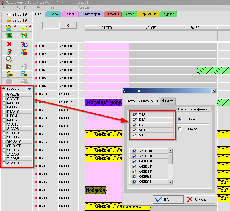 Это так же касается и других модулей программы: План по типам, Счета, Группы, Горничные, Журнал, Тариф.