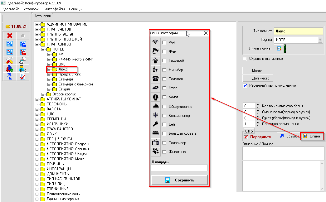 Настройка опций категорий комнат