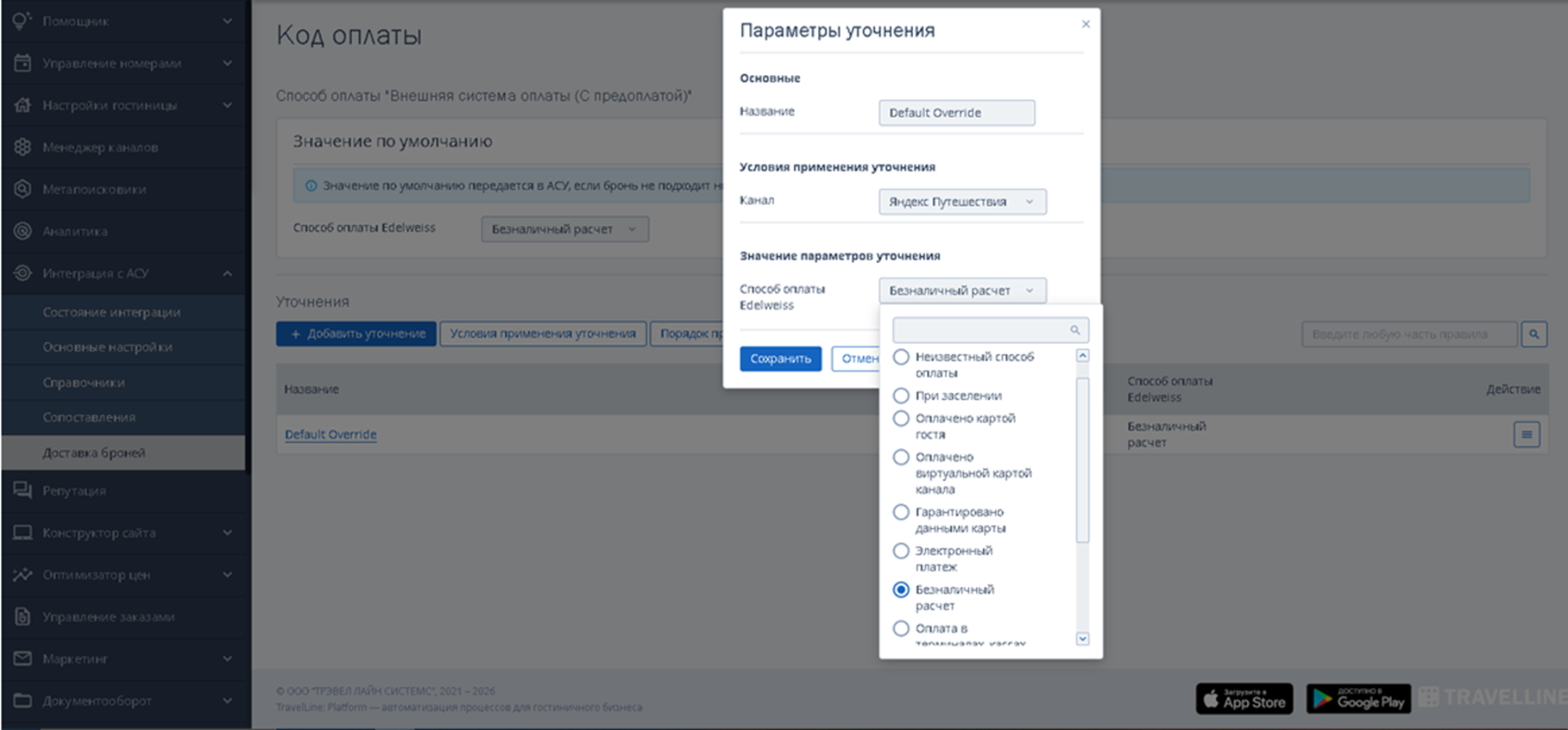 Чтобы включить данный сценарий, в настройках канала TravelLine в поле «Способ оплаты Edelweiss» выберите любой вариант, кроме: