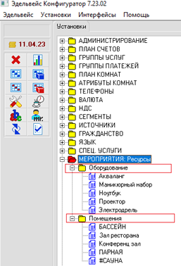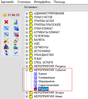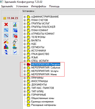 Основные настройки справочников модуля «Мероприятия» выполняются в дереве параметров конфигуратора: