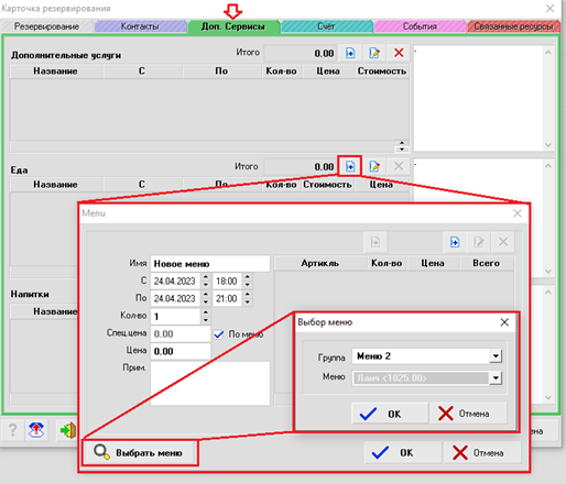 - Наличие добавленных меню позволит быстро добавлять список услуг питания в карточке резервирования «Доп. Сервисы»/«Еда» нажатием кнопки «Выбрать меню»: