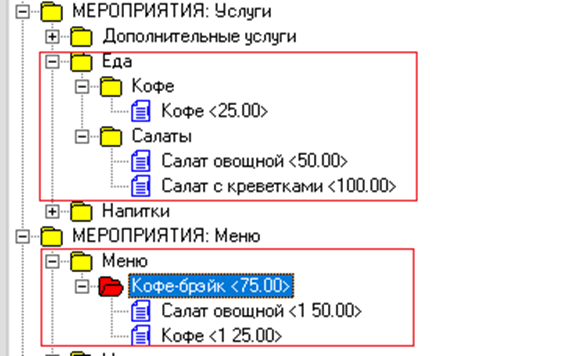 - Для удобства и ускорения заполнения заявки можно создавать «Меню», наполняя их едой, созданной ранее в пункте «Мероприятия: Услуги»: