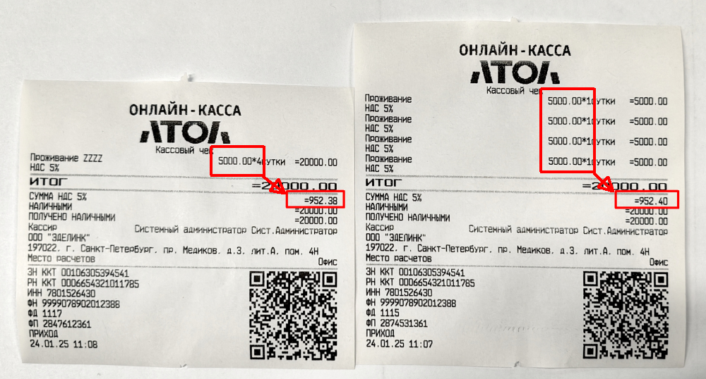 Налог при группировке в чеке - рассчитывается как 5/105 от общей суммы по каждой переданной позиции или от суммы сгруппированной позиции - от 20000 * 5/105 = 952,38