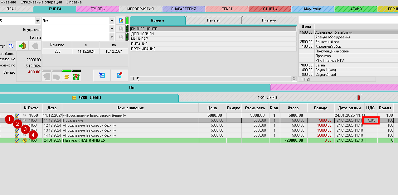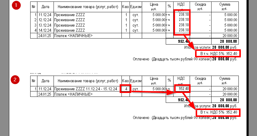 счёт, на котором четыре услуги Проживание со ставкой налога 5% с ценой 5000 каждая.