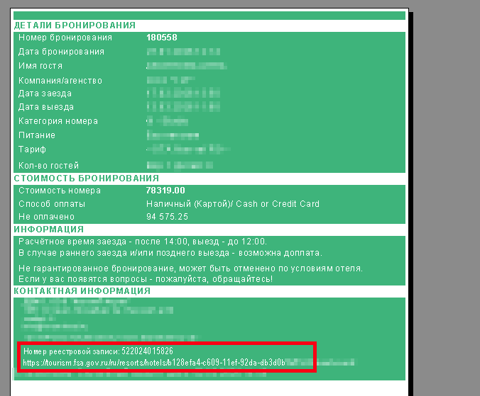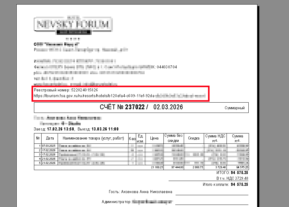 В случае, если данные были введены у юрлица и производится печать форм у гостя / группы, реквизиты регистрации будут выводиться в формах.