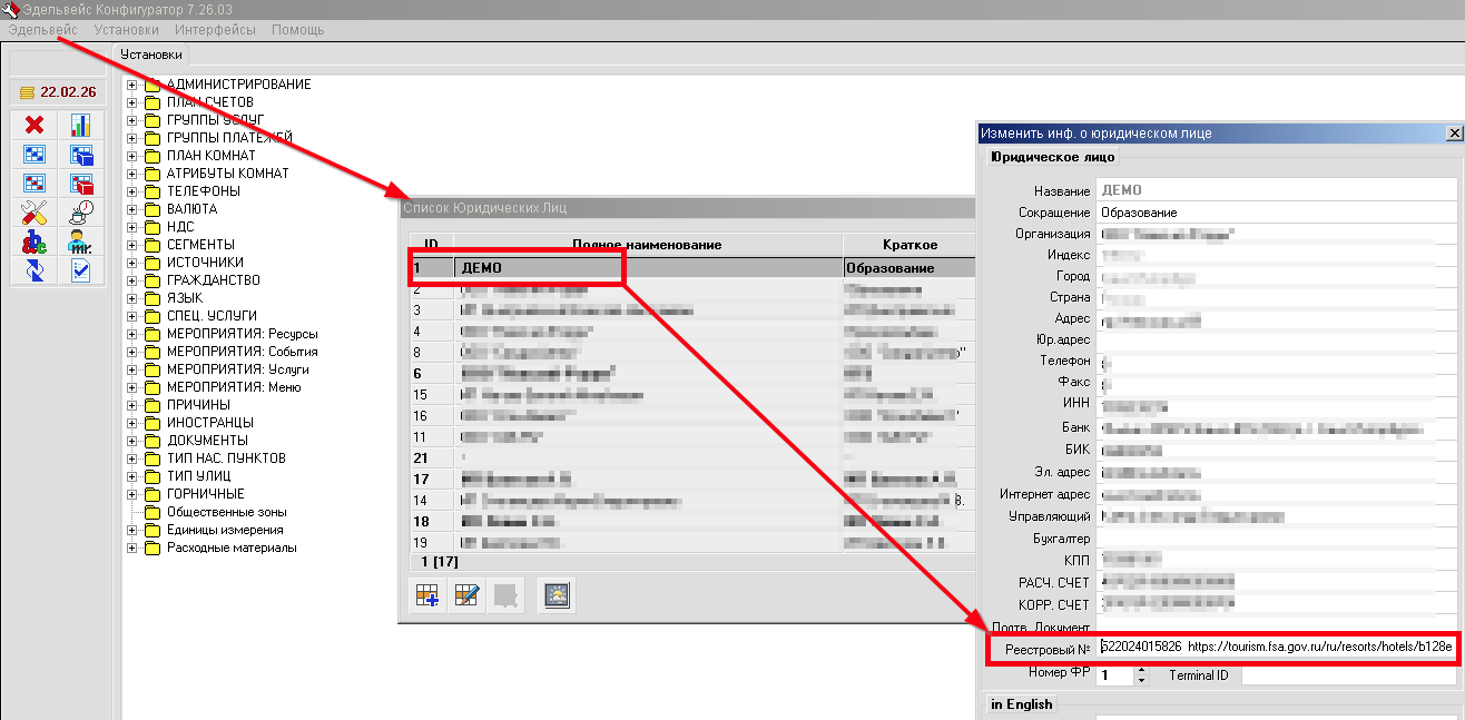 В версии АСУ "Эдельвейс" 7.26.03 (март 2026-го года), в настройках юрлиц добавлена возможность указания данных о регистрации средства размещения в едином реестре объектов классификации (ФСА).