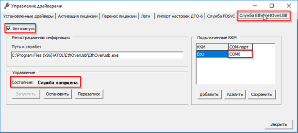 Следует убедиться в верности указанного COM-порта, а так же убедиться что служба EthernetOverUSB в статусе «Служба запущена» и установлен флаг "Автозапуск"