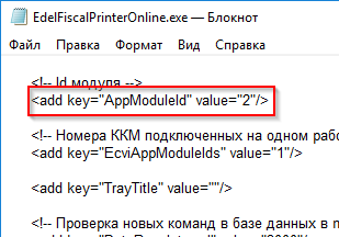 После того как скопируете новые файлы модуля, открывайте конфиг-файл EdelFiscalPrinterOnline.exe и обратите внимание на следующие позиции: