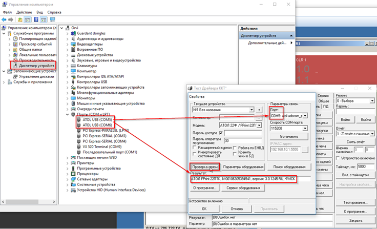 Как видно по скриншоту выше – по порту COM5 подключен сам фискальный регистратор (видим через «Проверку связи» модель ФР, это означает что ФР определяется в Тесте драйвера и готов к работе), соответственно порт COM6 отводится для выгрузки чеков в ОФД, этот COM порт указывается в утилите «Управление драйверами» (вызывается в пункте меню Пуск – ATOL – Управление драйверами):