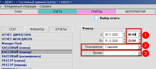 2. Теперь сводный кассовый отчёт за период можно сформировать выбрав конкретного пользователя системы, тем самым получить суммарные данные по выбранному сотруднику за период.