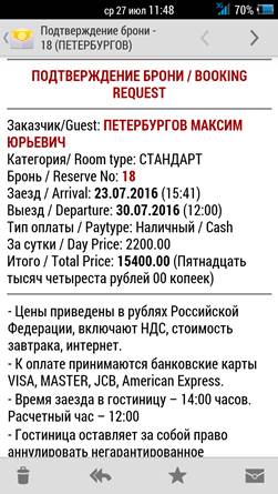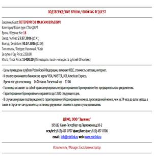 Электронное письмо-подтверждение, отправляется на адрес гостя в формате HTML: