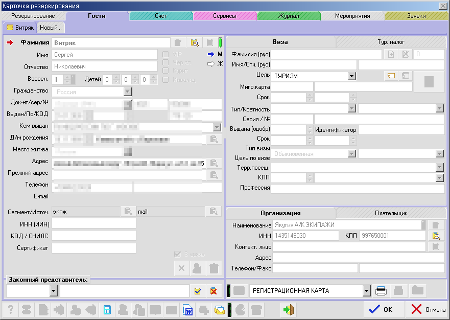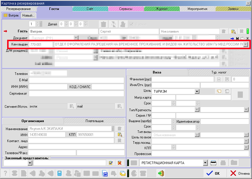 В версии 7.26.04 - произвели перекомпоновку полей данных гостя в карточке резервирования. Цель: расширить некотрые поля в карточке для их полного отображения (например: орган выдавший документ)