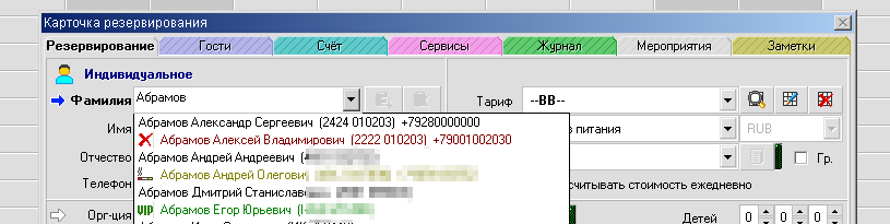 В версии АСУ 6.21.12 мы заменили дополнительно появлявшийся (отдельный) диалог поиска гостя в архиве при наборе фамилии на диалог с выпадающим списком при совпадении с набираемыми символами.