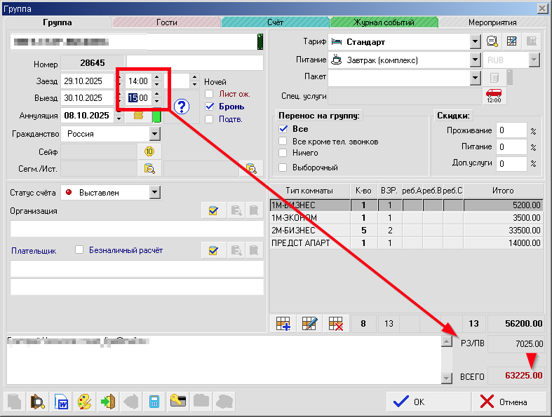 В случае группы расчёт будет производиться по каждой заявке гостей группы и суммироваться с учётом всех данных каждого гостя.