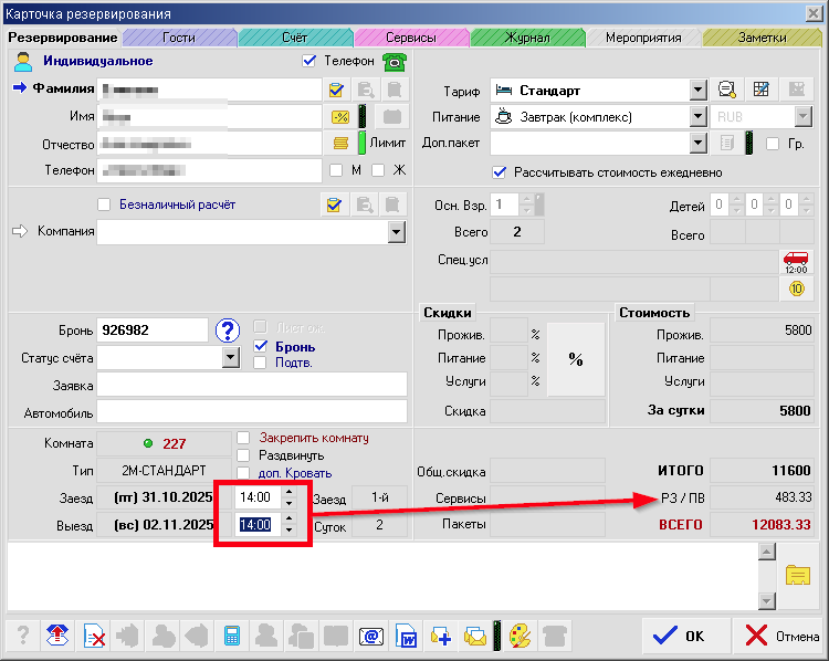 и предварительный расчёт сумм за ранний заезд и поздний выезд.