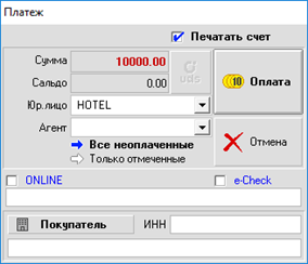 По кнопке Оплата в системе зафиксируется оплата с соответствующей суммой, если оплата фискального типа (карта/наличные), то при подключенном кассовом аппарате напечатается чек.