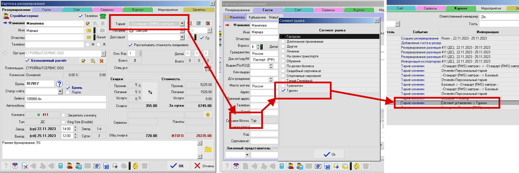 При указании тарифа или его смене в карточке гостя, при наличии указанного сегмента, он будет установлен в карточку гостя автоматически. Таким же образом сегмент тарифа будет подставляться при автоматическом поступлении заявок из каналов бронирования.