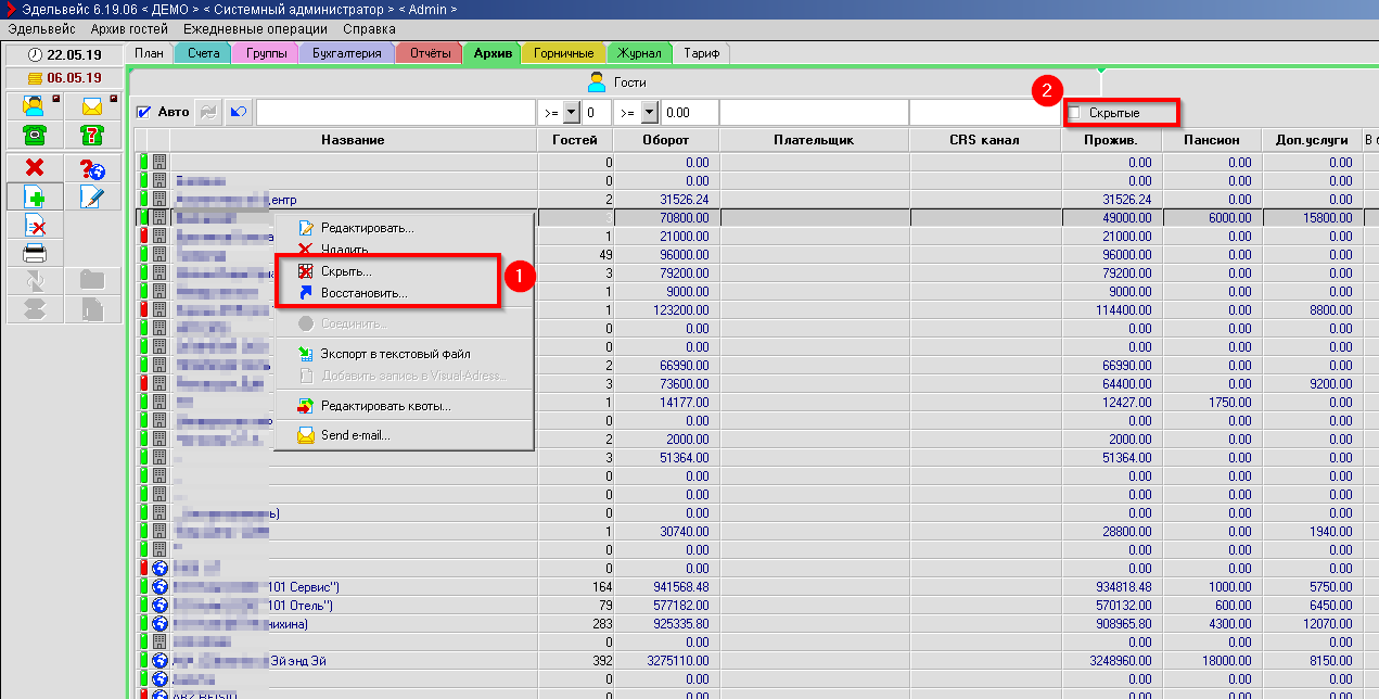 В версии программы 6.19.06 - в модуле Архив добавлена дополнительная функция (помимо Удаления) - "Скрыть": скрытие организации из списка доступных.