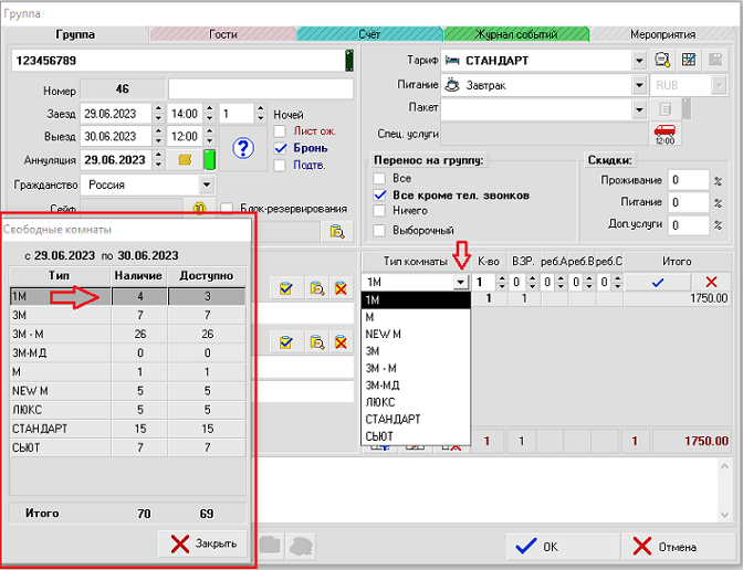 После установки дат заезда и выезда группы пользователю следует выбрать количество бронируемых номеров для участников группы, это действие выполняется в окне: