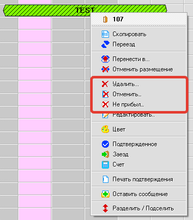 Для того, чтобы удалить бронирование нажмите на это бронирование правой кнопкой мыши и выберите вариант удаления: