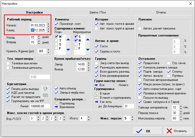 В случае, если графический план заканчивается на определенной дате, но при этом требуется создавать резервирования в будущем периоде за датой окончания плана, следует увеличить значение Рабочего периода в Конфигураторе (C:\EDEL\