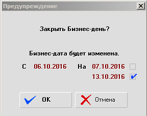 Система спросит вас, действительно ли вы хотите закрыть бизнес-день. Щелкните мышью на "ОК", и бизнес-день будет закрыт, а бизнес-дата будет изменена.