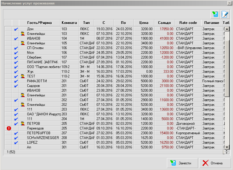 Восклицательные знаки в некоторых строках говорят о том, что после закрытия бизнес-дня гостям будет автоматически занесена задолженность за прожитые сутки, а галочки в других строчках означают, что задолженность за эти сутки уже была занесена гостям ранее.